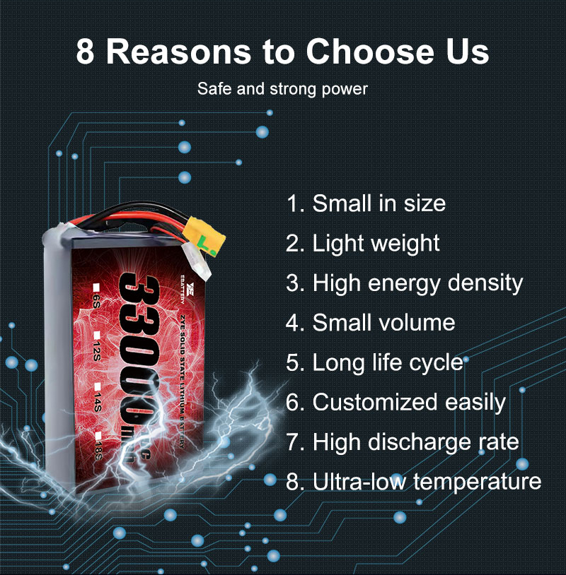 Tecnología de vanguardia: baterías de estado sólido con alta densidad de energía y seguridad, incluidaBatería de litio de estado sólido liviano 32000MAH 30000MAH 5C10C Fácil de personalizar 2S3S45S6S UAVS BATERY PACK.