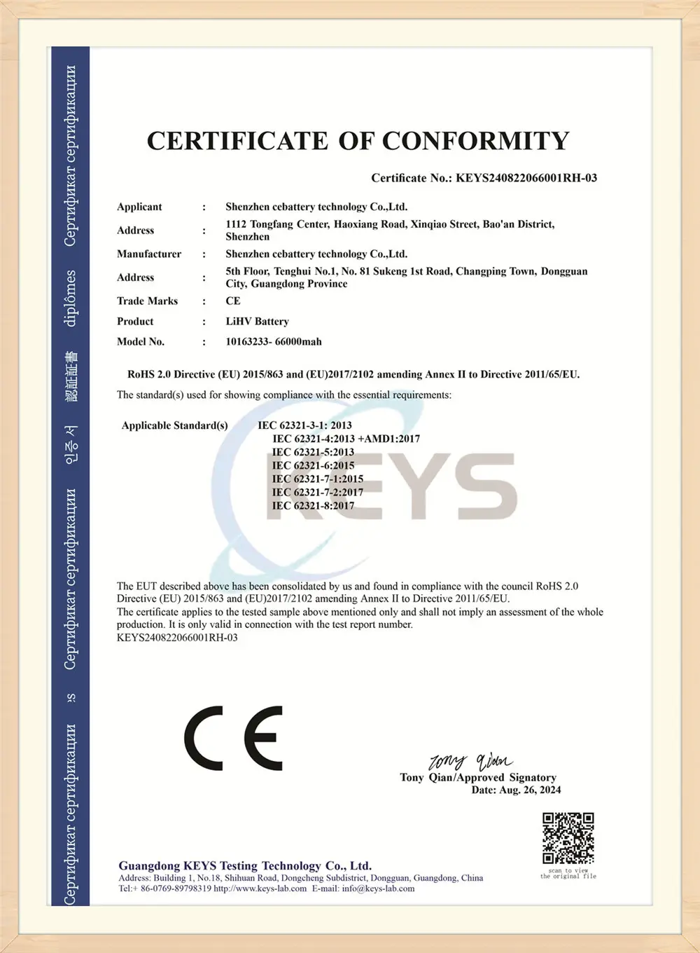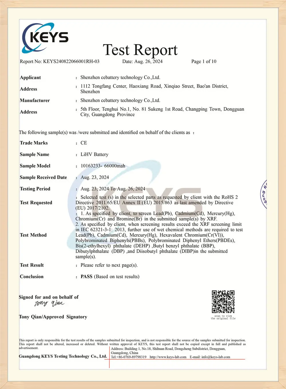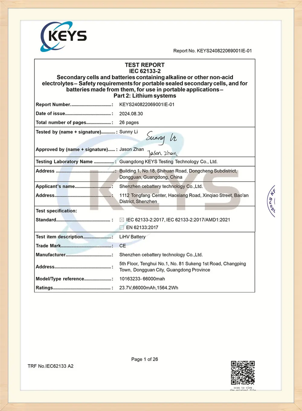 ZyebatteySiempre persigue la filosofía comercial de "calidad primero, orientada al servicio, promesas de mantenimiento de la integridad". Para ser el mejor y más estable proveedor de baterías, proporcionamos tecnología de batería recargable de alta calidad y Zyebattey ha aprobado muchas certificaciones de autoridad, como ISO9001: 2015, UL, CE, FCC, UN, 3C, etc.