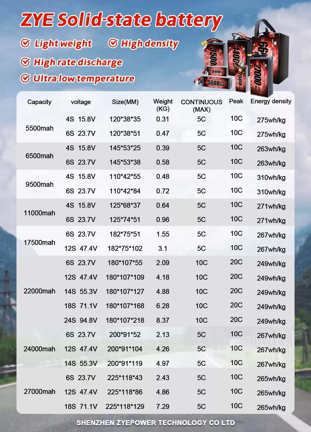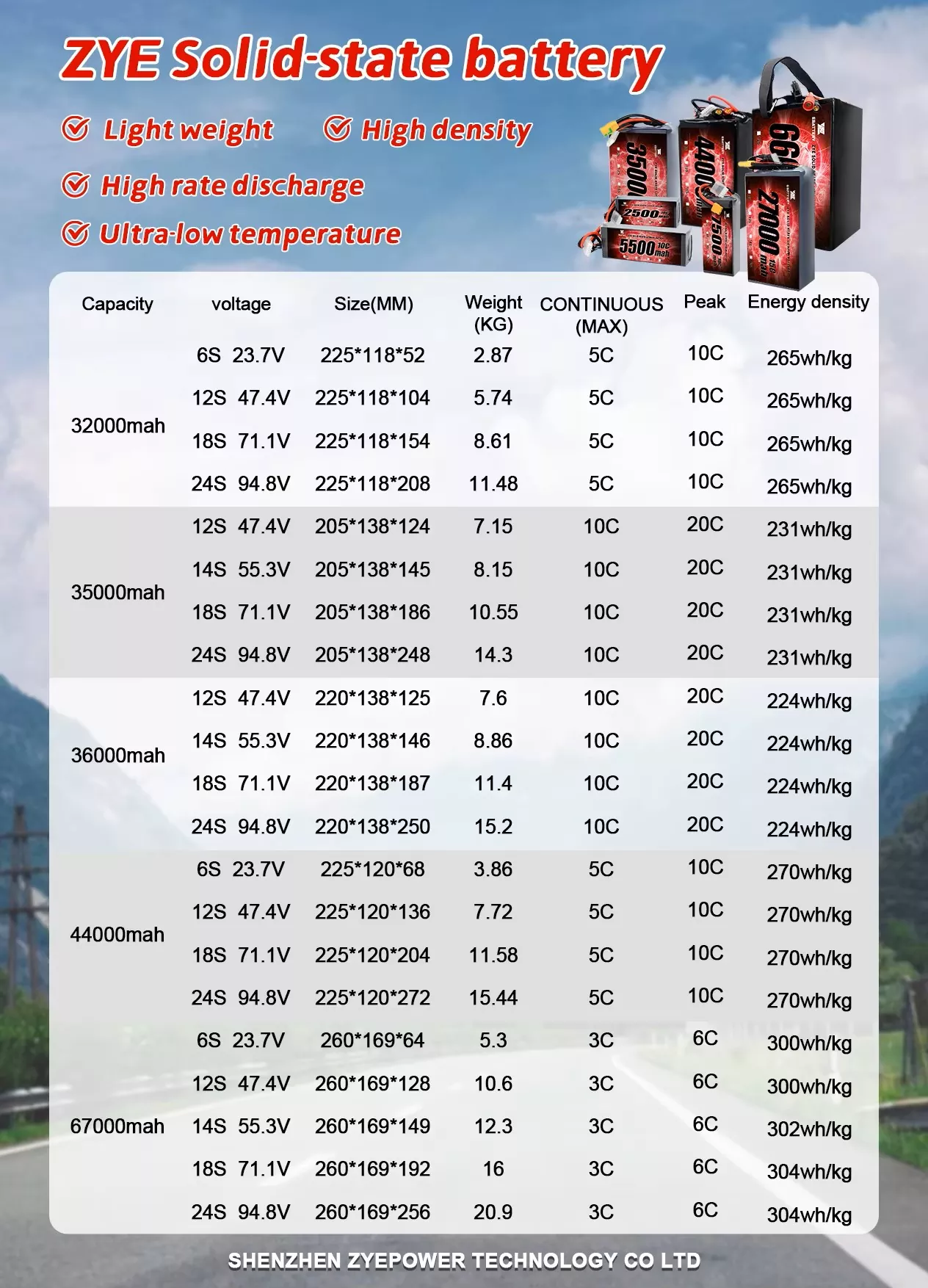 Como una fabricación original para producir batería de estado sólido LIHV 6S, Zye Ebattery ha proporcionado miles de baterías a proveedores de drones de todo el mundo mensualmente. La batería de estado sólido LIHV 6S se puede ensamblar diferentes capacidades a 2S a 24s de 2500 mAh a 132000 mAh con alta densidad de energía. Para ser un proveedor confiable, Ebattery puede garantizar la producción mensual de la batería de estado sólido de LIHV 6S y el precio de fábrica mayorista más barato. Cada solicitud de los clientes se responde dentro de las 24 horas, ¡bienvenidos para contactarnos con sus requisitos!